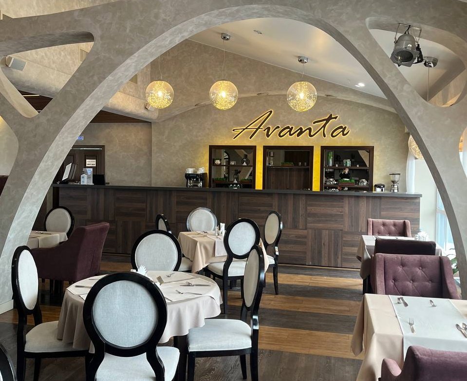Интерьер ресторана, расположенного на девятом этаже гостинично-ресторанного комплекса «АВАНТА», оформлен в современном стиле, который сочетает в себе элегантность и комфорт. Система кондиционирования обеспечивает оптимальный микроклимат, а яркий свет софитов создает уютную и непринужденную атмосферу. Мягкие диваны и удобные зоны для отдыха приглашают гостей насладиться временем в приятной обстановке.