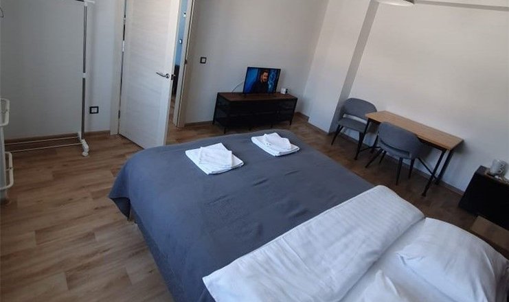 В номере: вешалка, зеркало, кровать двуспальная, прикроватные тумбочки, стол, стулья, шкаф, кондиционер, мини-холодильник, телевизор, чайная станция