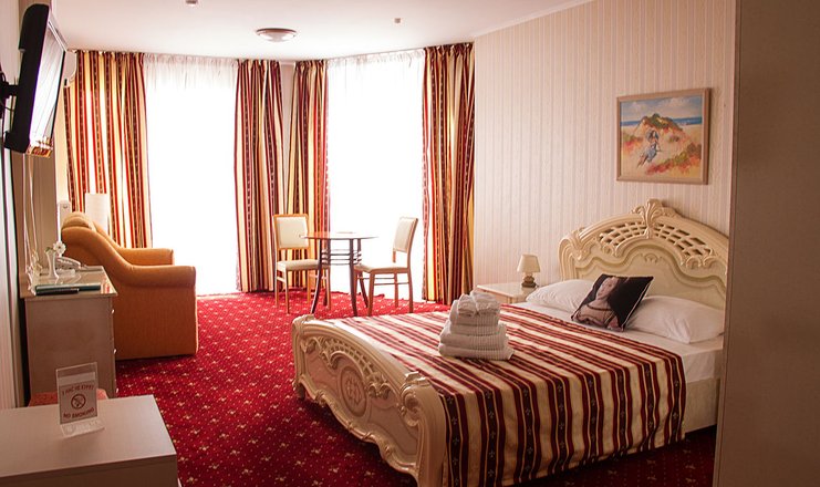 В номере: диван, зеркало, кровать двуспальная, прикроватные тумбочки, стол, стулья, кондиционер, мини-холодильник, сейф, телевизор ЖК, телефон