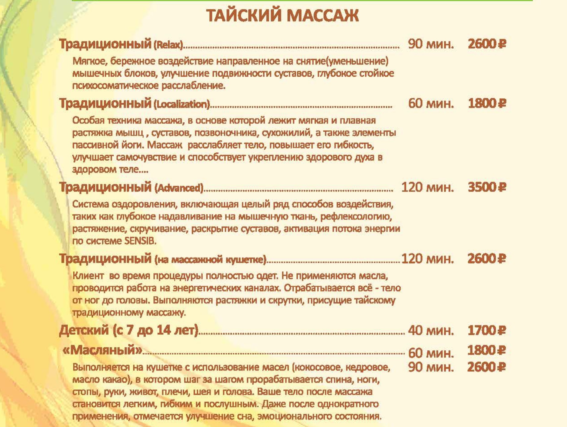Цены на СПА услуги