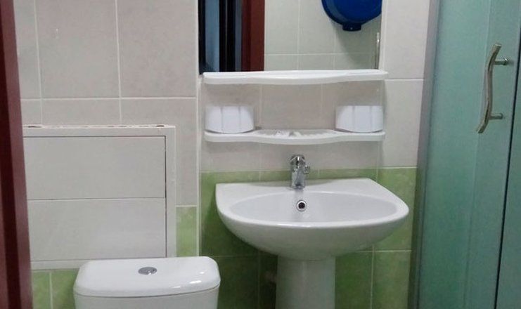 Санузел: душевая кабина, раковина, унитаз, туалетные принадлежности