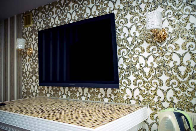 В номере: вешалка, зеркало, кресло-кровать 2, кровать двуспальная, прикроватные тумбочки, столик журнальный, шкаф, мини-холодильник, набор посуды, телевизор, электрочайник