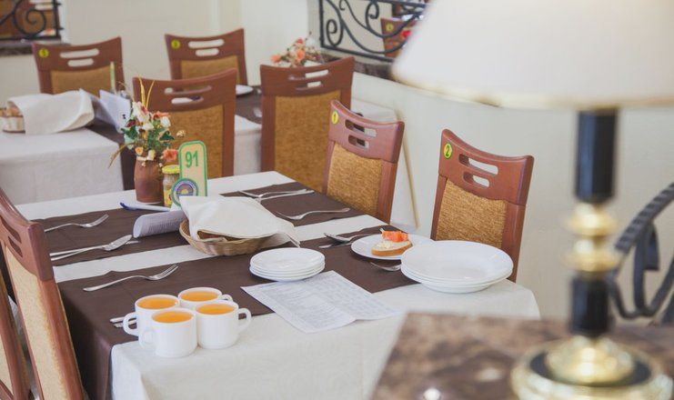 Столовая, с двумя уютными обеденными залами на 500 посадочных мест, расположена в главном корпусе санатория на втором этаже. В санатории организовано пятиразовое питание в одну смену, а для больных сахарным диабетом и лиц, нуждающихся в частом и дробном питании, предлагается дополнительный завтрак в 11:00 часов.