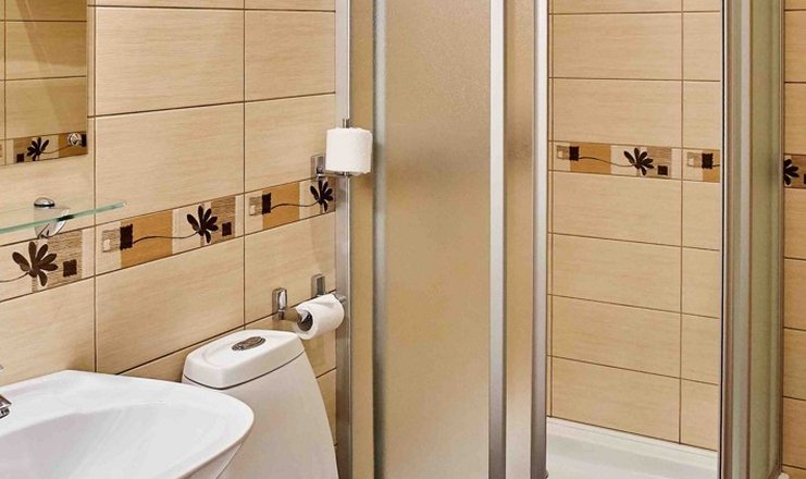 Санузел: с душевой кабиной, тапочки, туалетные принадлежности, фен