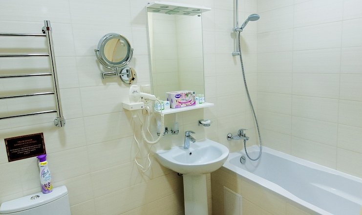 В номере: кровать двуспальная, стол, столик туалетный, стулья, гладильная доска, набор посуды, сейф, сплит-система, телевизор, утюг, холодильник, электрочайник